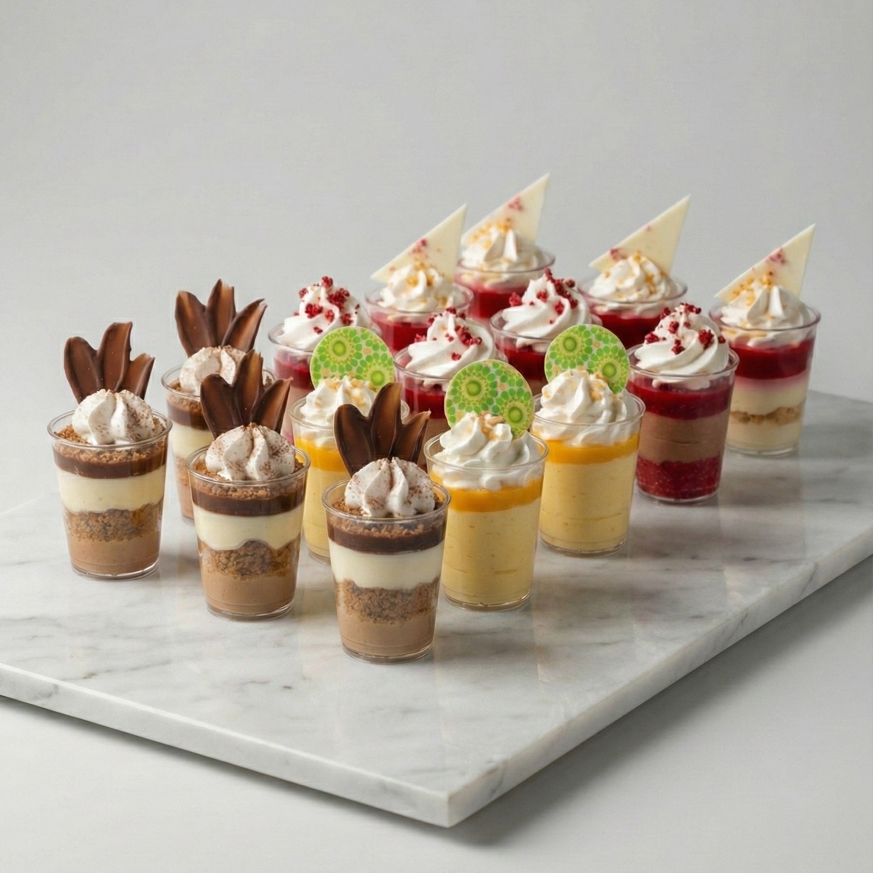 Perfect for brunches, showers, and celebrations, our mini dessert cups are the ultimate crowd-pleaser. Each cup is beautifully layered, deliciously flavored, and artfully decorated to impress. With a variety of gourmet flavors in every box, they’re ready to serve and guaranteed to wow your guests—dessert done for you!